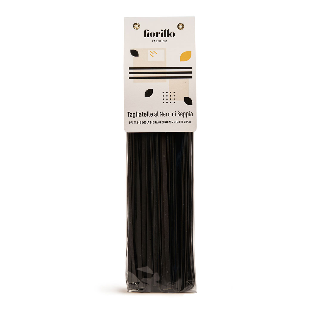 Tagliatelle all'archetto aromatizzate al nero di seppia. Pasta di semola di grano duro a lenta essiccazione, aromatizzata.